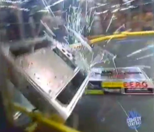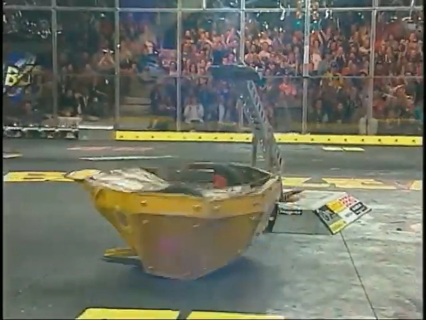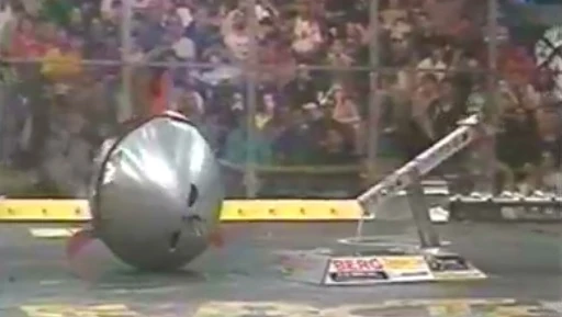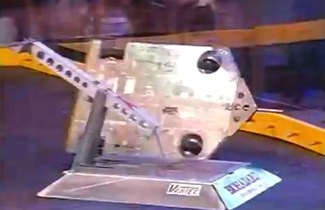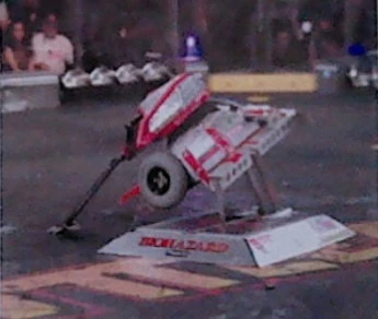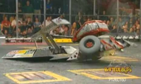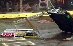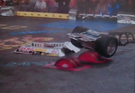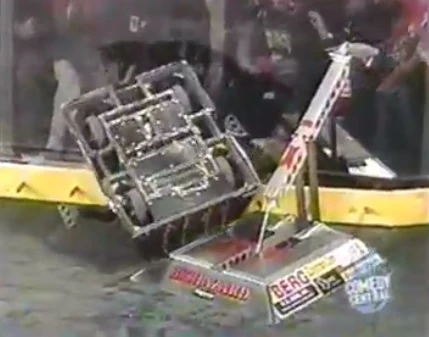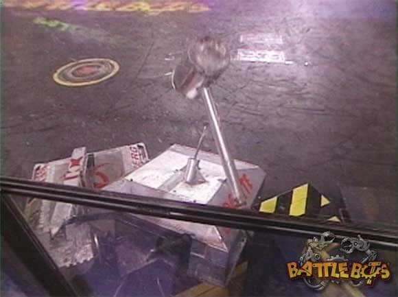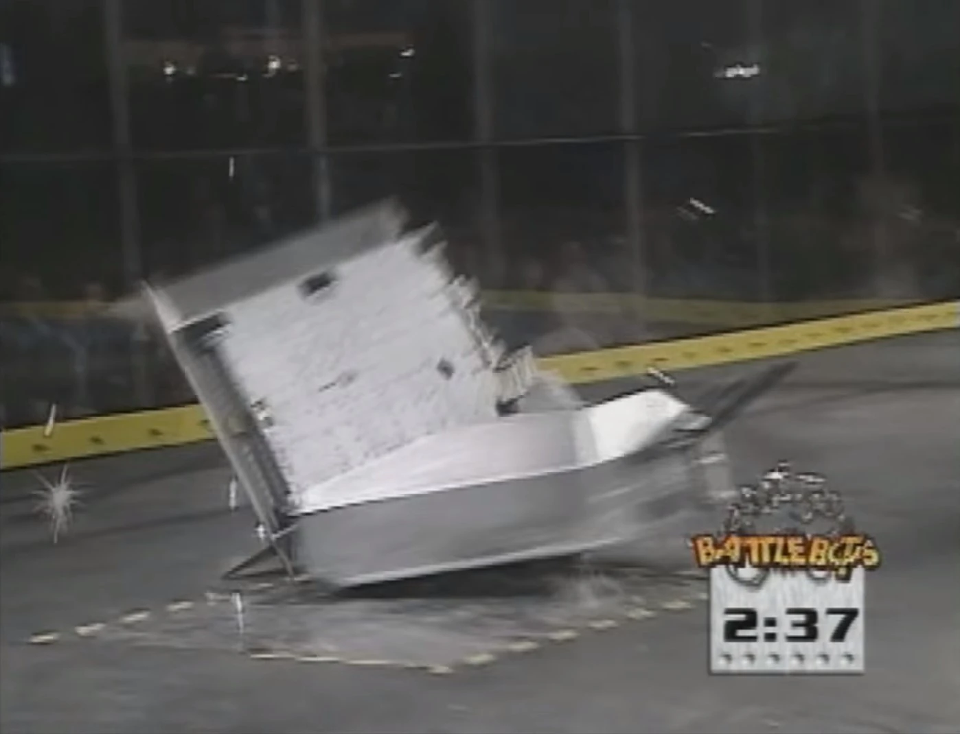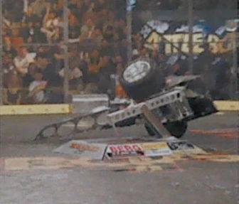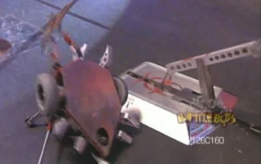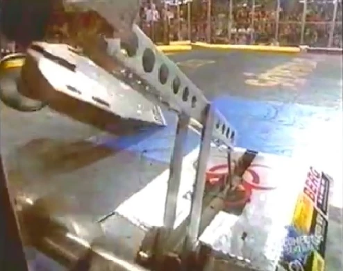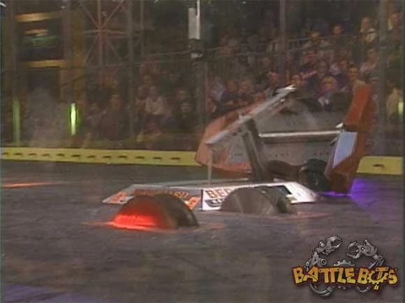 BioHazard's anti-wedge skirts prevented Suicidal Tendencies' wedge from getting underneath it. To make matters worse for Suicidal Tendencies, BioHazard was too low for its pickaxe to reach. After nearly getting stuck under the spikestrip, BioHazard managed to get the upper hand and pin Suicidal Tendencies under the pulverizer with its lifting arm. After driving some more, BioHazard eventually pinned and flipped Suicidal Tendencies over the killsaws, taking one of its tracks off. BioHazard chased its competitor down and pinned it against the Lexan. With only a few seconds left, BioHazard managed to pin Suicidal Tendencies between the pulverizer's mounting and the Lexan wall, literally suspending the bot in mid-air. BioHazard did its victory dance and won on a unanimous 45-0 judge's decision.
