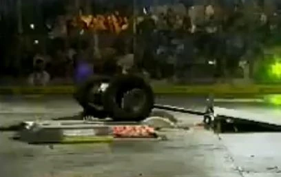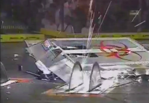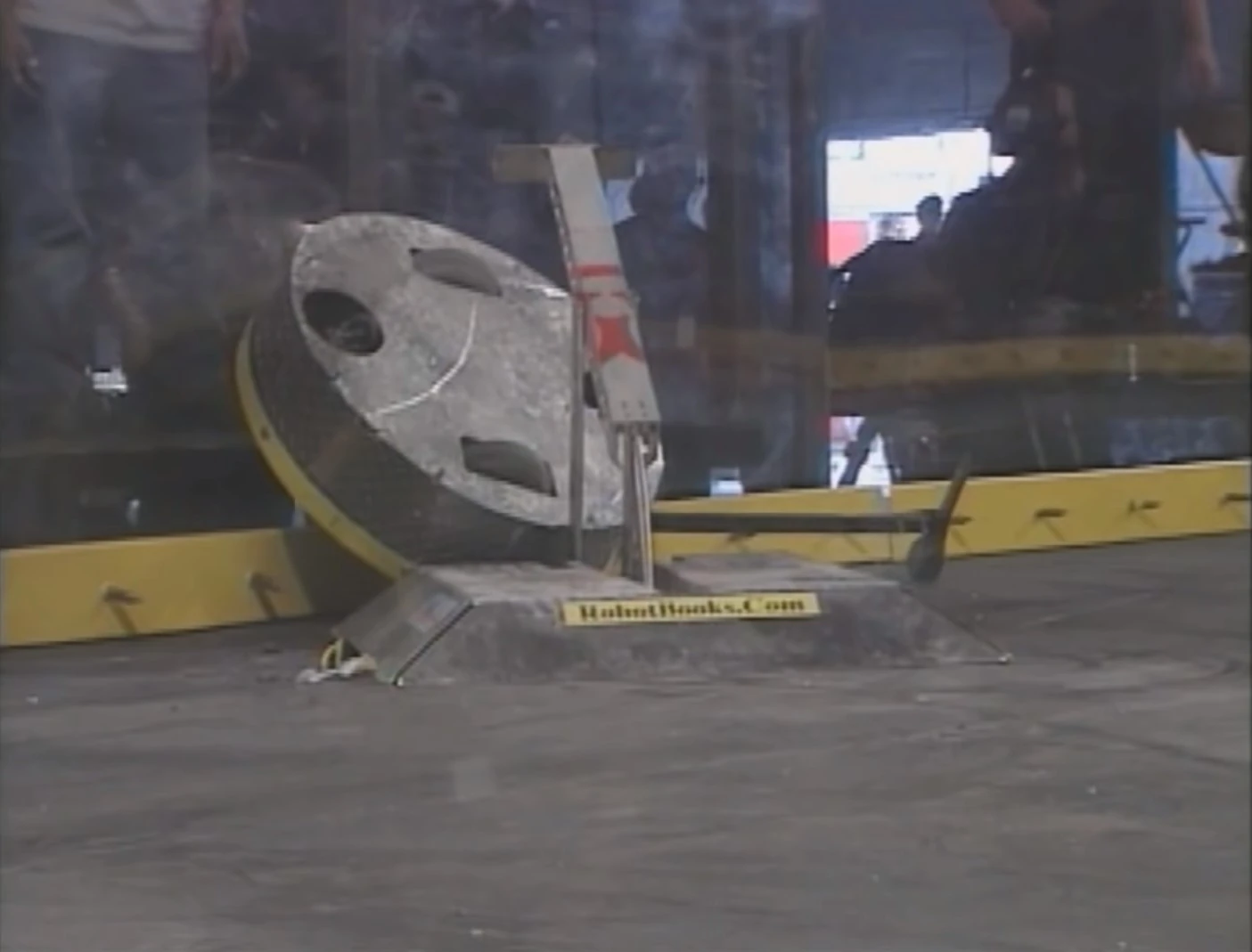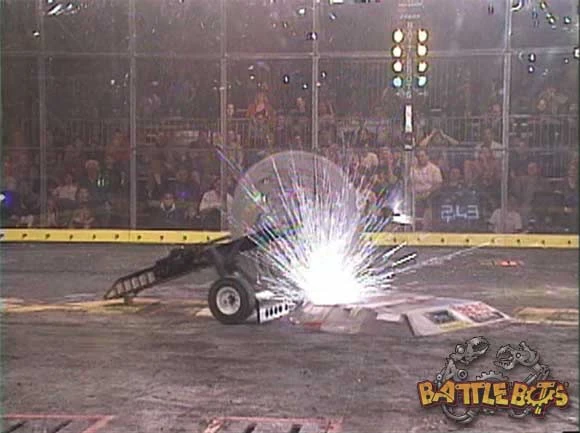 BioHazard's foe moved slowly hoping to test their new tail and anti wedge devises that circled its perimeter. The only chance that Tazbot had to get under BioHazard was when it drove itself over the killsaws and a skirt was lifted for one second but Tazbot missed this chance. BioHazard soon pushed Tazbot against the arena wall where it got underneath Tazbot and flipped it onto the killsaws. During the remaining four minutes, Tazbot tried to self-right with its arm before it was counted out. BioHazard won by KO at 2:34 and advanced to the next round, where it faced KillerHurtz.